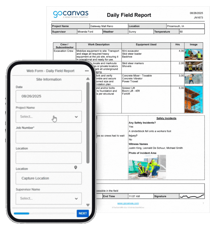By digitizing the daily report process, GoCanvas helps eliminate re-entry errors, track productivity, and keep everyone informed in real time. Supervisors can easily review progress, attach photos, and send automated reports back to the office with a single tap.