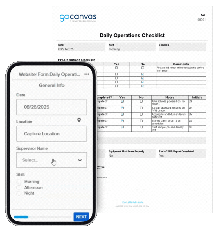 The Daily Operations Checklist by GoCanvas replaces paper checklists with a digital tool that keeps field teams organized and accountable. Managers can assign tasks, track progress, and flag issues in real time from any device. The checklist helps ensure every task is completed on schedule, reducing delays and keeping projects on track. With automated reminders, signature capture, and cloud sync, teams can verify work instantly and share updates seamlessly.