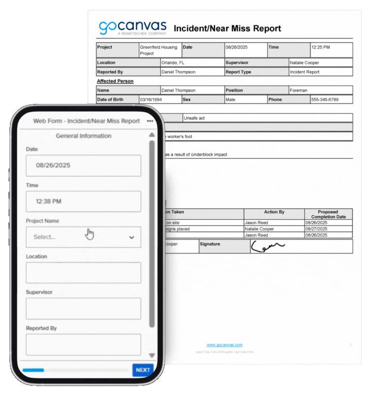 GoCanvas improves incident reporting by allowing users to capture and submit reports directly from the jobsite using mobile devices. Teams can attach images, add signatures, and log GPS data in seconds. This eliminates paperwork delays and ensures safety leaders get accurate, real-time information for faster response and prevention.