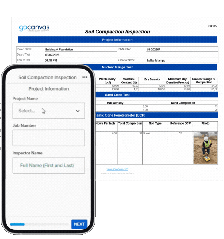 The Soil Compaction Test Form by GoCanvas lets field crews record and verify soil density, moisture, and compaction data directly from their mobile devices. Capture photos, test readings, GPS data, and signatures on-site for fast, accurate documentation. The app streamlines testing by calculating results instantly and storing them securely in the cloud. Integration with tools like Google Sheets, Dropbox, SharePoint, and Salesforce helps teams stay compliant and organized.