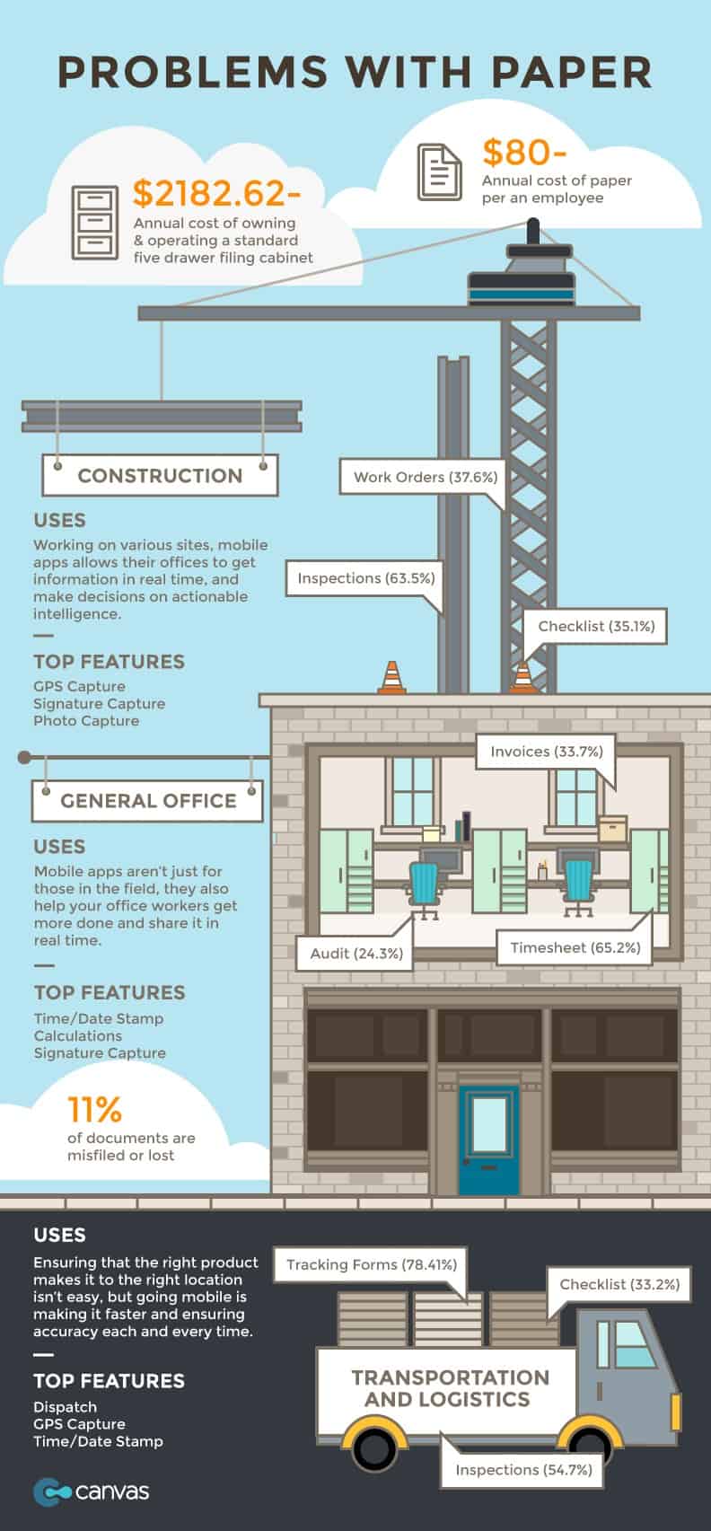 Mobile apps aren’t just for those in the field, they also help your office workers get more done and share it in real-time (Invoices 33.7%; Auditing 24.3%; Timesheets 65.2%). 11% of documents are misfiled or lost.