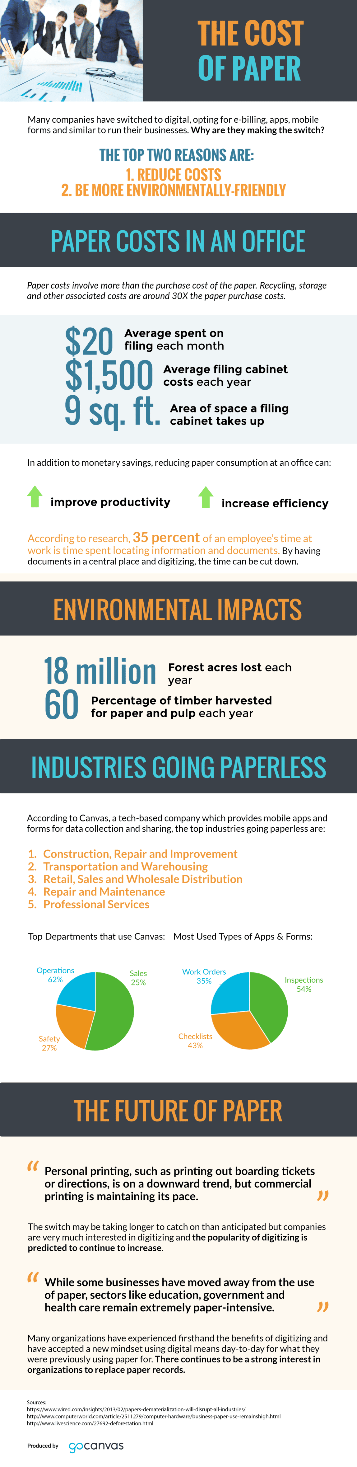 According to Canvas, a tech-based company that provides mobile apps and forms for data collection and sharing, the top industries going paperless are: