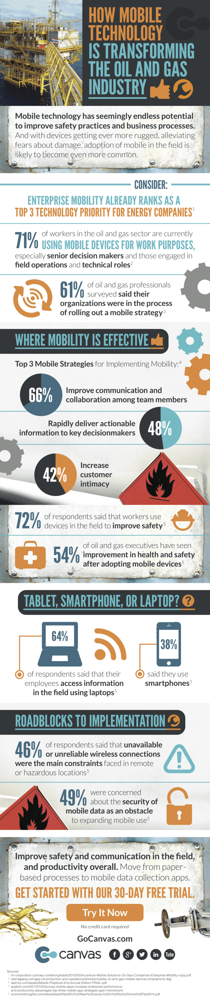 Top 3 mobile strategies for implementing Mobility: 66% Improve communication and collaboration among team members. 48% rapidly deliver actionable information to key decision-makers. 42% Increase customer intimacy. 72% of respondents said that workers use devices in the field to improve safety. 54% of oil and gas executives have seen improvement in health and safety after adopting mobile devices.